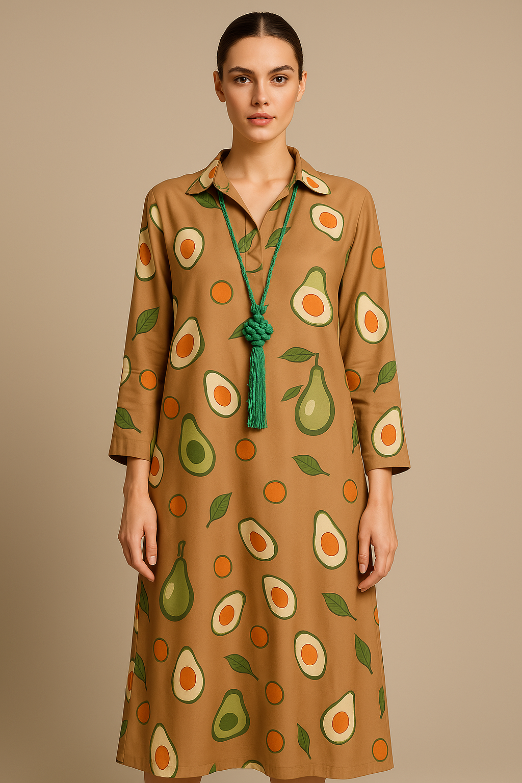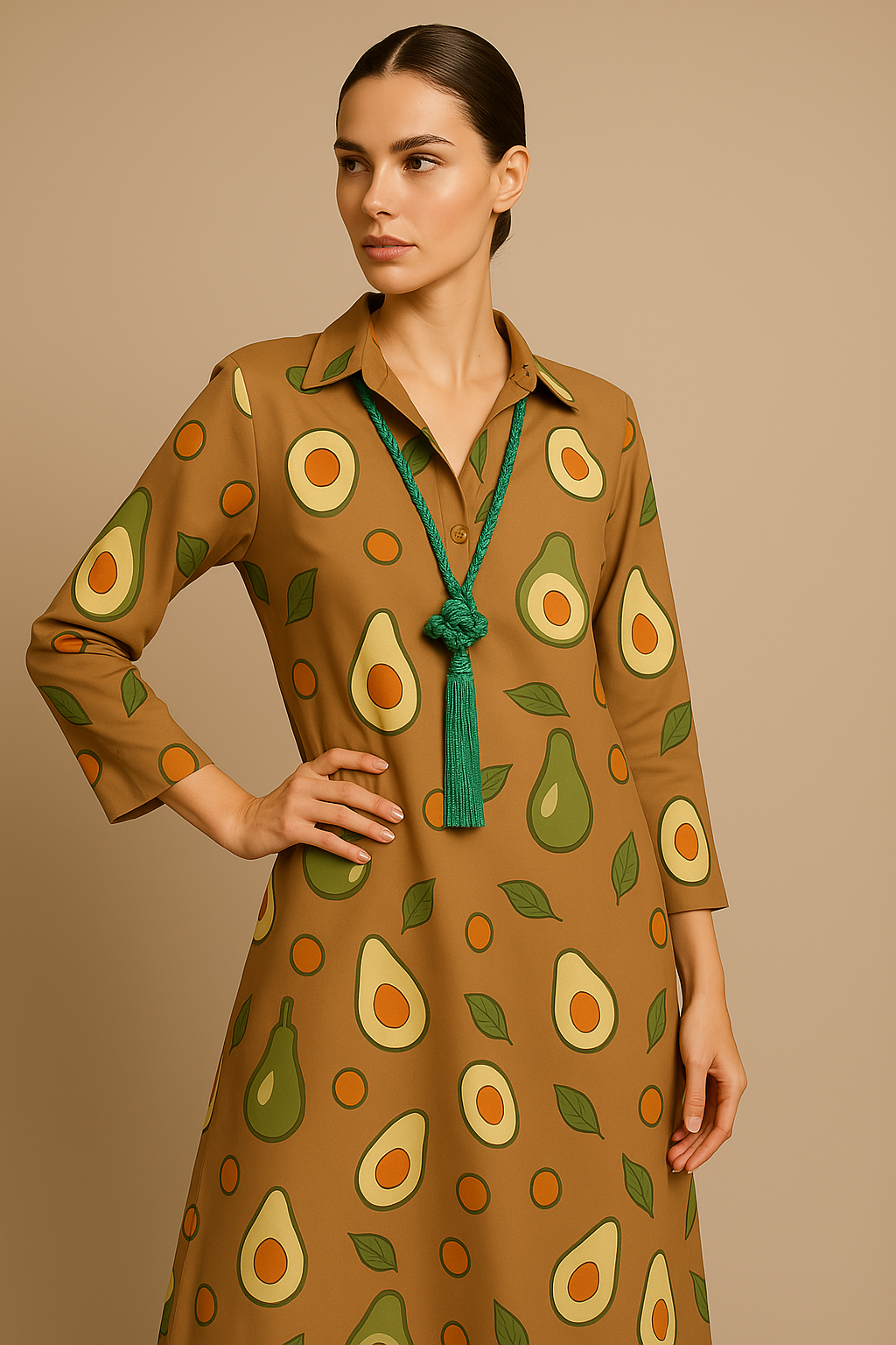 Avec son imprimé audacieux d’avocats stylisés sur fond caramel, cette robe incarne la rencontre entre tradition artisanale et clin d’œil contemporain.